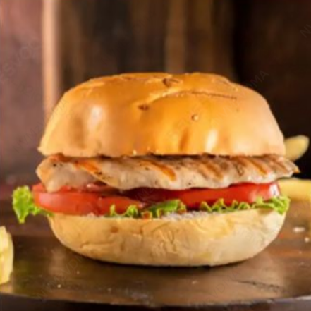 Hamburguesa con pechuga de pollo a la plancha, lechuga crespa, tomate y salsa ranchera incluye papa francesa.