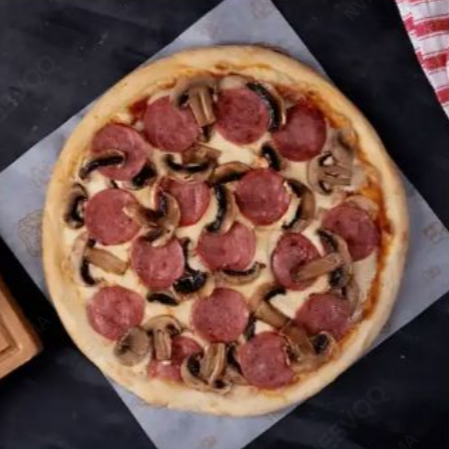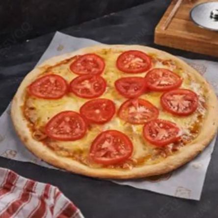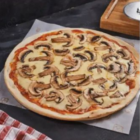 Pizza con champiñón, tomate confitado, aceituna morada, albahaca, reducción balsámica y queso parmesano.