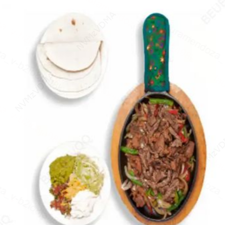 Fajita de carne, cebolla blanca, pimentón, lechuga fresca, pico de gallo, guacamole, sour cream y 5 tortillas blandas.
