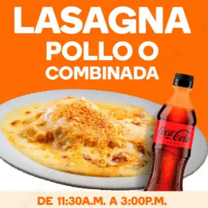 Lasagna con queso mozzarella, carne o combinado, en salsa napolitana, gratinado con queso parmesano, Coca Cola Zero 400 ml.
