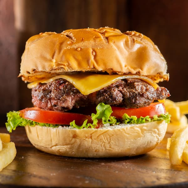 Hamburguesa con queso con lechuga crespa, tomate cebolla y queso amarillo, servida con papas a la francesa.