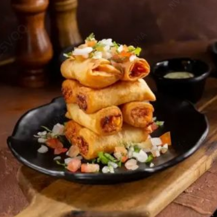 Tortillas crujientes, pollo ligeramente picante, queso amarillo, maíz tierno, pico de gallo y salsa de chimichurri.