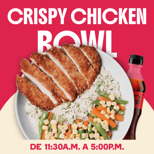 Delicioso bowl con base de arroz cremoso de cilantro, acompañado con julianas de pollo crispy y vegetales salteados, Coca Cola Zero 400 ml.