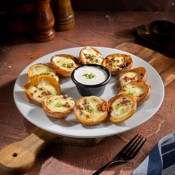 Cortezas de papa doradas y crujientes, rellenas con queso mozzarella, cebollín, tocineta y sour cream.