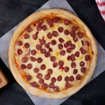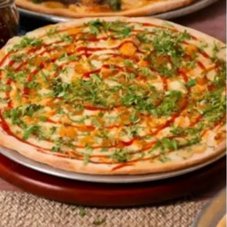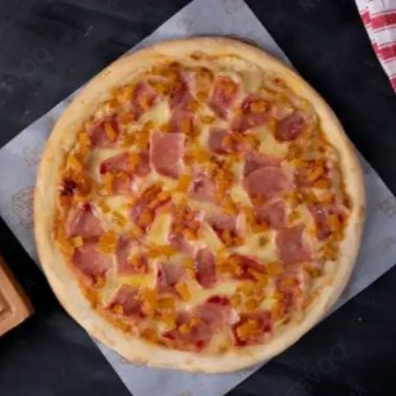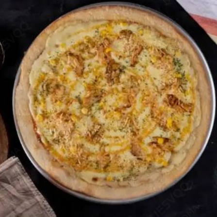 Pizza con pollo grillé, maíz tierno, salsa mostanesa BBQ, queso parmesano y perejil.
