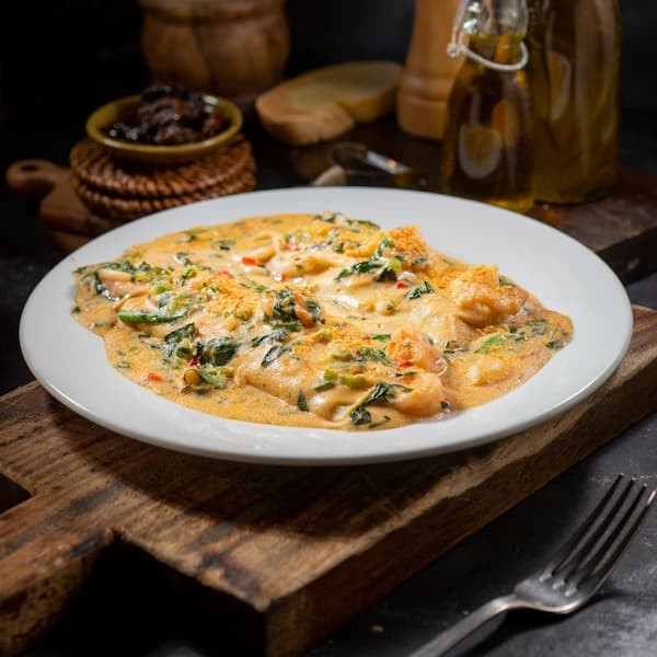 Crepes con pollo, cebolla y pimentón con salsa bechamel y queso parmesano, servidos con pan francés con mantequilla y ajo.