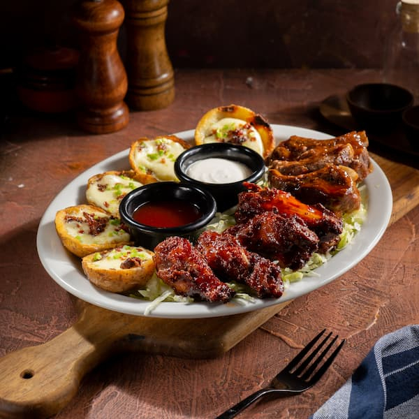 Alitas ligeramente picantes, costillas BBQ agridulce y potato skins, acompañadas con una salsa agridulce y sour cream.