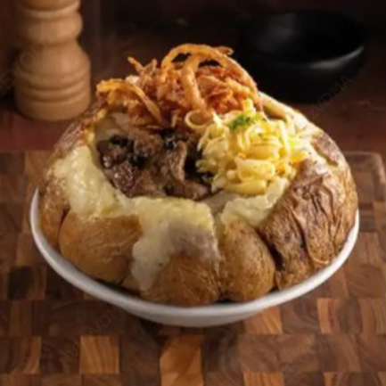 Papa rellena de lomito fino en salsa a la pimienta, queso cheddar y cebolla crispy.