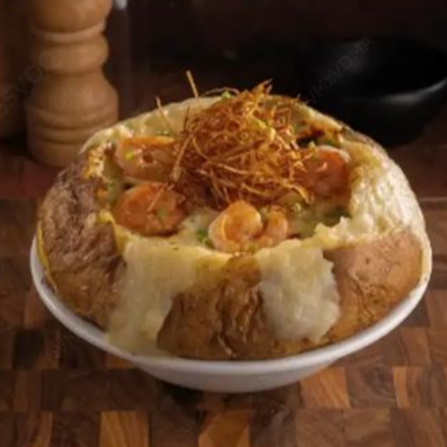 Papa rellena de camarones al ajillo en salsa bechamel, perejil con cebolla, puerro frita y cebollín.