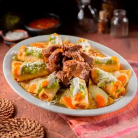 Picada con lomito, nachos de queso y flautas con pollo. acompañado de lechuga, frijol refrito, guacamole y salsa picante aparte.