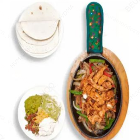 Fajita de pollo, cebolla blanca, pimentón, lechuga fresca, pico de gallo, guacamole, sour cream y 5 tortillas blandas.