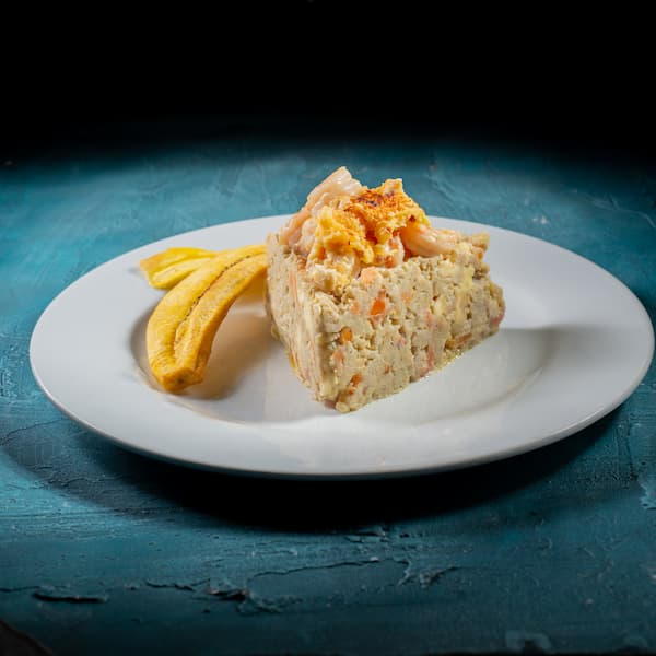 Cayeye hecho con mote de guineo verde, mantequilla, cebolla, queso costeño y camarones en salsa mornay.