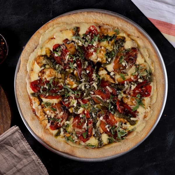 Pizza con pollo grillé, tomate confitado, queso gruyere, salsa pesto, reducción de balsámico y albahaca.