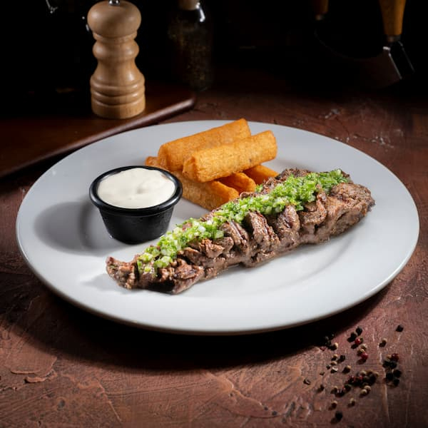 Lomo fino 300 g bañado con salsa del chef incluye croquetas de yuca y sour cream.