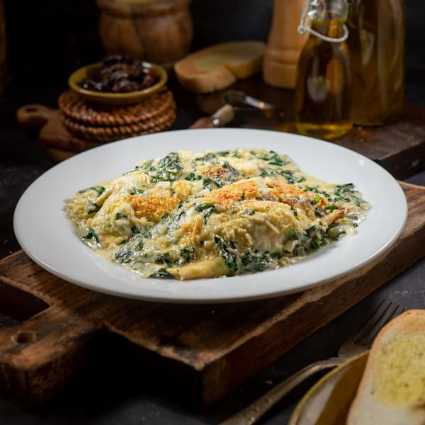 Crepes con pollo con espinaca, cebolla con salsa bechamel y queso parmesano, acompañado con pan francés con mantequilla y ajo.