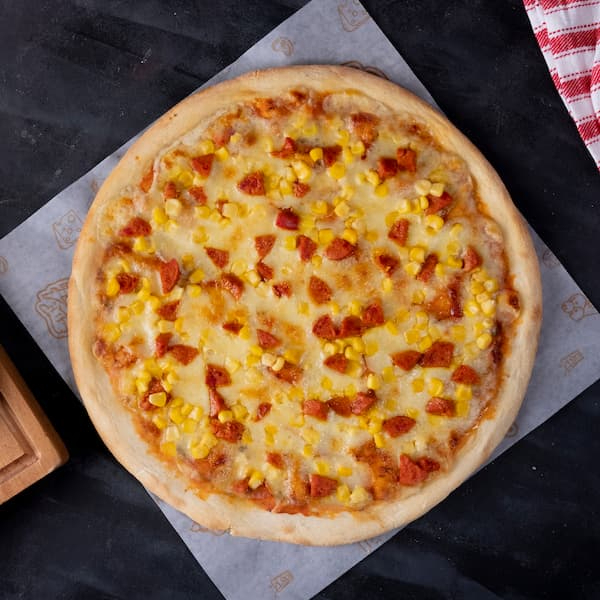 Pizza con chorizo y maíz tierno.