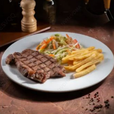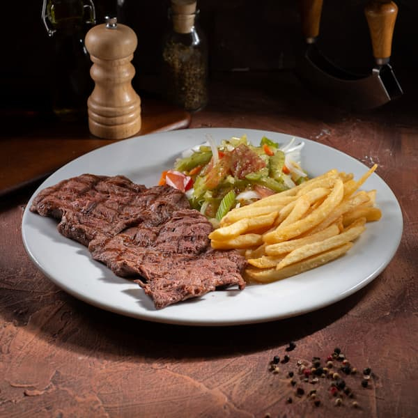 Carne de lomo ancho, de corte grueso 300 g asada a la parrilla, acompañado de papa a la francesa y ensalada de la casa.