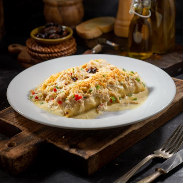 Crepes con pollo, cebolla y pimentón con salsa bechamel y queso parmesano, servidos con pan francés con mantequilla y ajo.