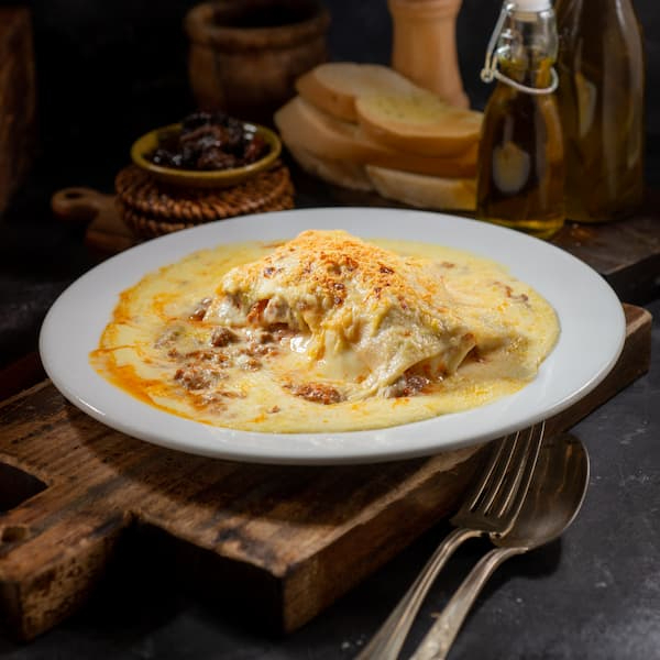 Lasagna con nuestra salsa boloñesa, queso mozzarella fundido, queso parmesano, pan francés con mantequilla y ajo.