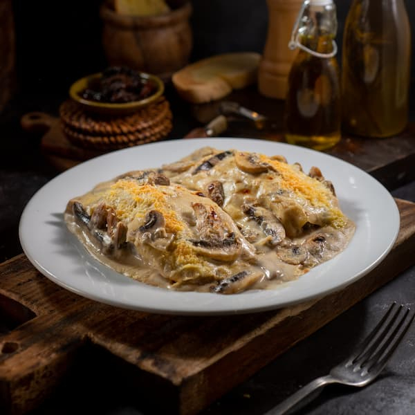 Crepes de pollo con champiñones, cebolla en salsa bechamel y queso parmesano, pan francés con mantequilla y ajo. 2 unidades.