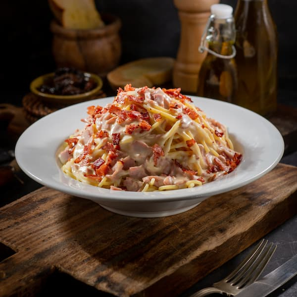 Pasta larga en salsa blanca, tocineta y perejil, acompañado con queso parmesano y pan francés con mantequilla y ajo.