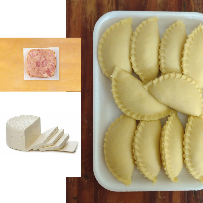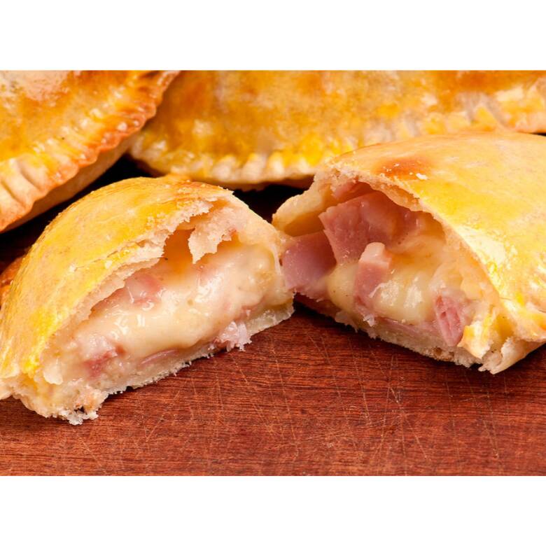 10 Empanadas fritas hechas de harina de trigo rellenas de jamón con queso costeño, deliciosas empanadas tamaño coctel.