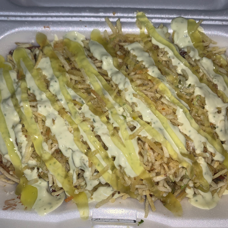 Papa salchicha, queso, butifarra, chorizo, chongo, lechuga y salsa