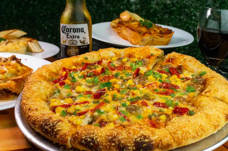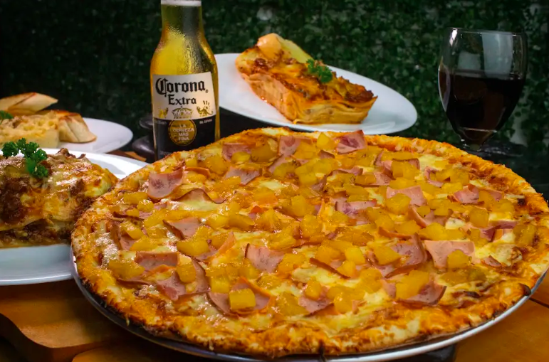 Pollo desmechado en salsa Alfredo, carne molida en salsa napolitana, gratinado de mozzarella y queso parmesano