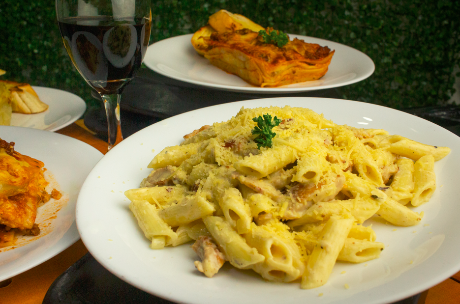 Pasta a elección (Fetuccini o Penne), salsa Alfredo, pollo, tocineta y queso parmesano.