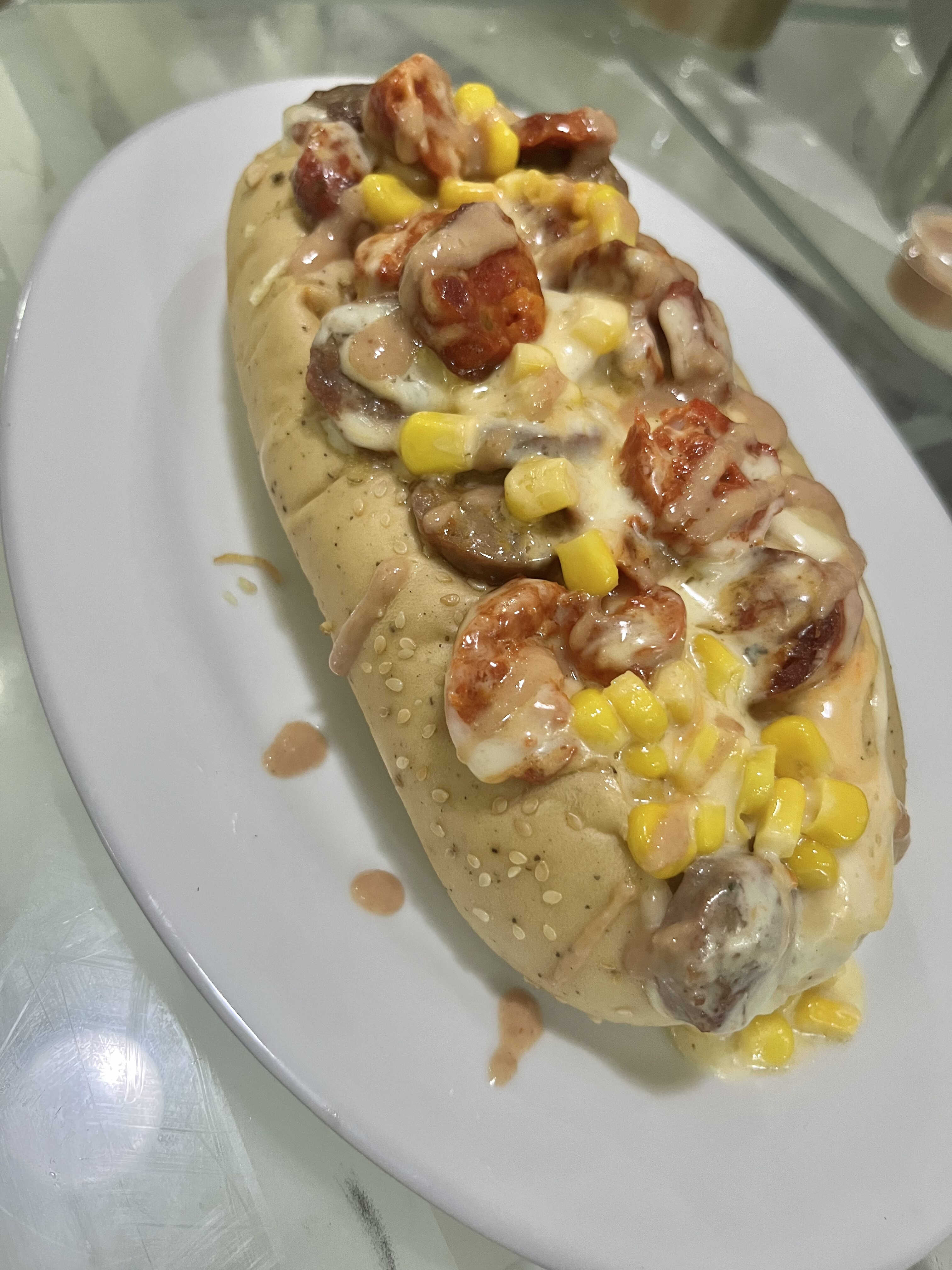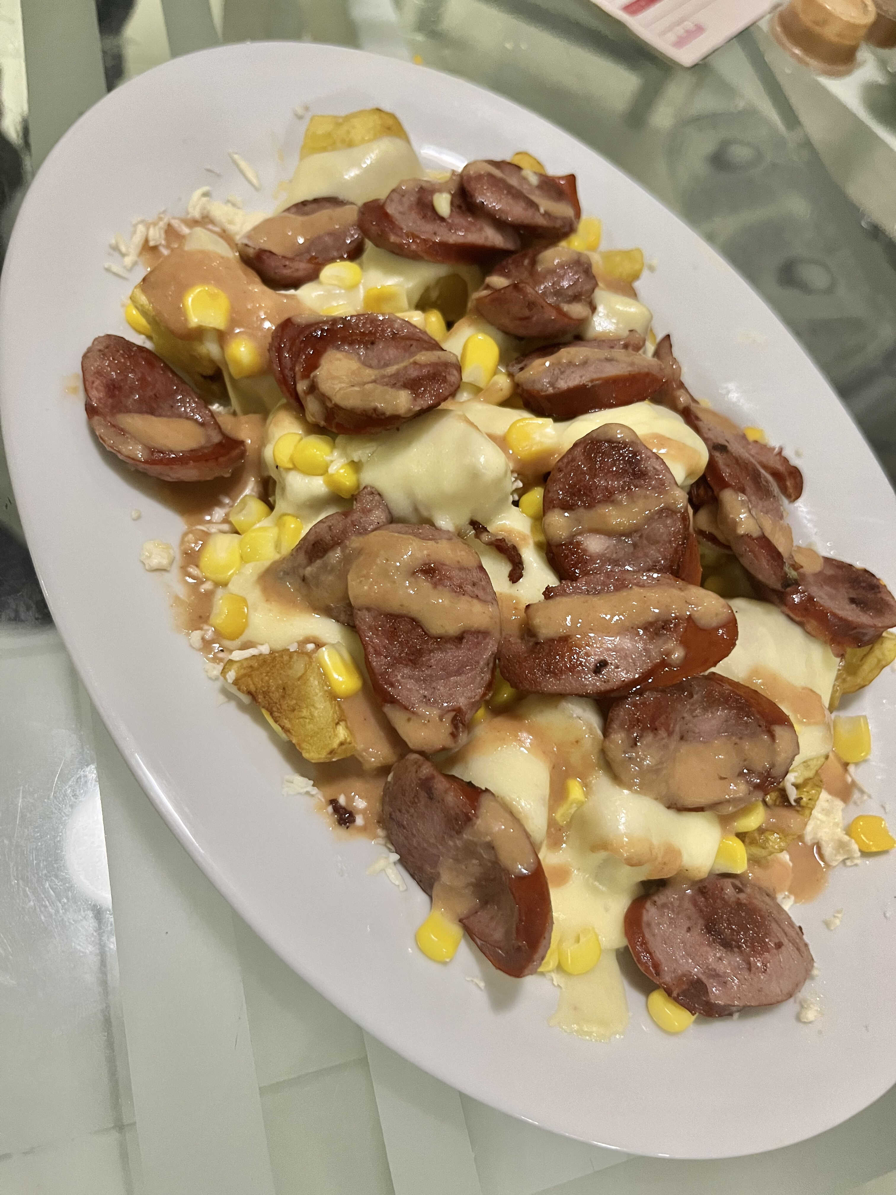 Papa criolla en cascos, salchicha ranchera, mozzarella gratinado, maíz y salsa de tocineta.
