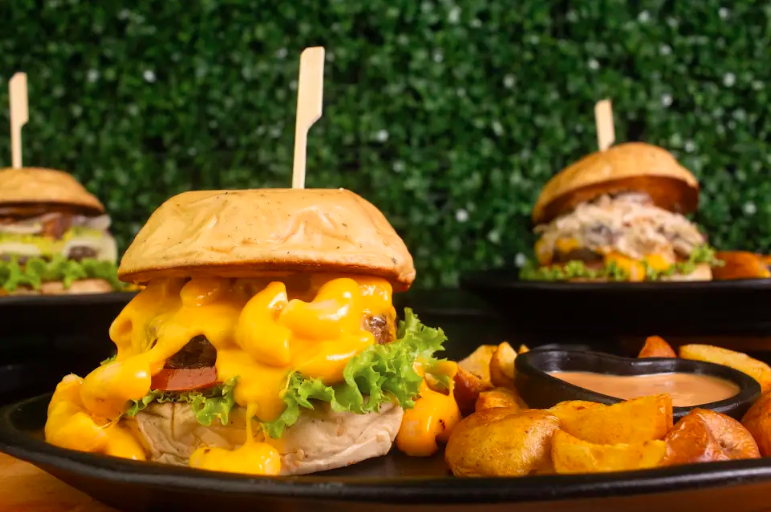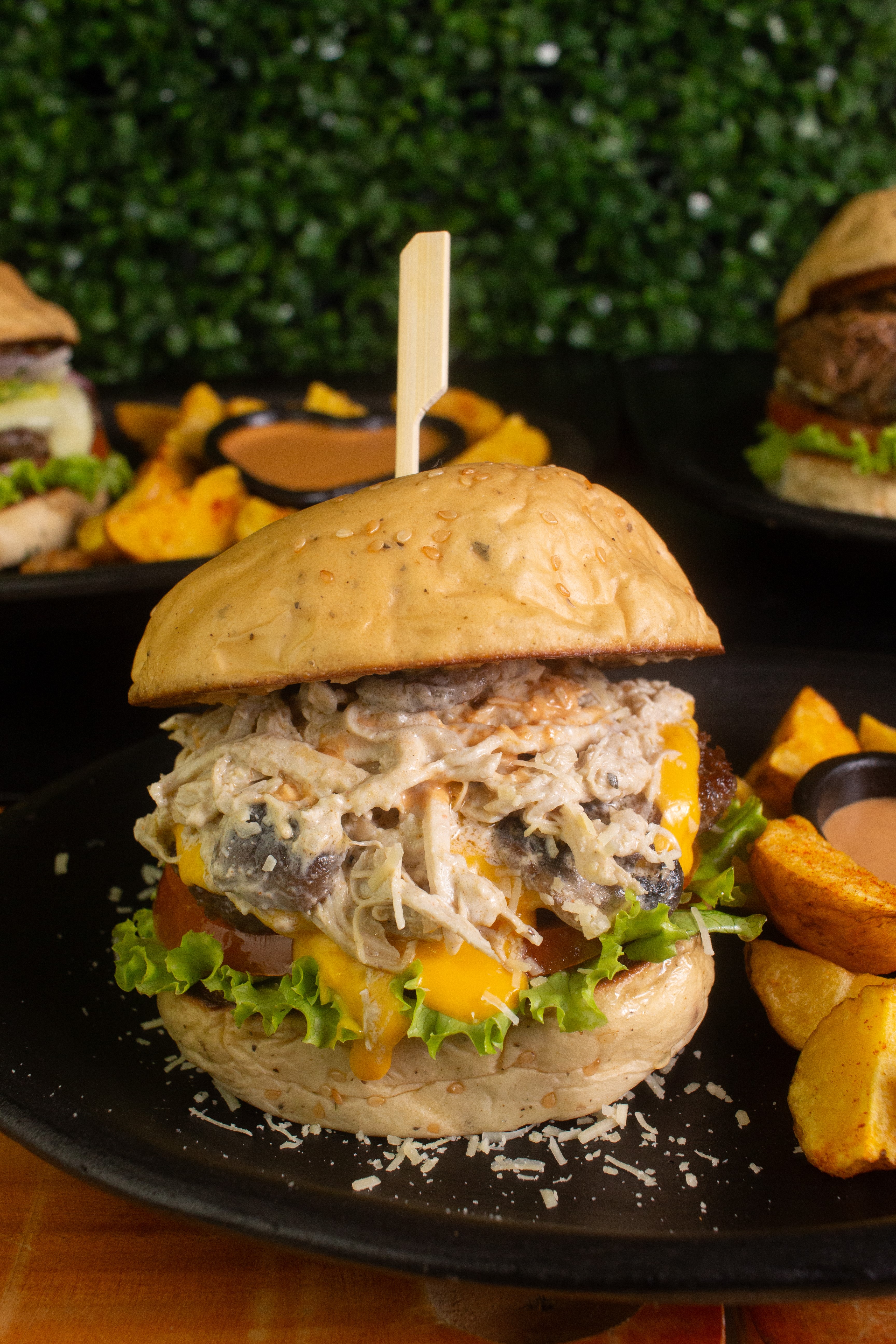 Pan finas hierbas, lechuga crespa, tomate, salsa de tocineta, carne de la casa 150 gr, pollo desmechado en salsa Alfredo, champiñones y queso cheddar acompañada de papas criollas en casco.