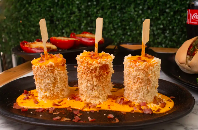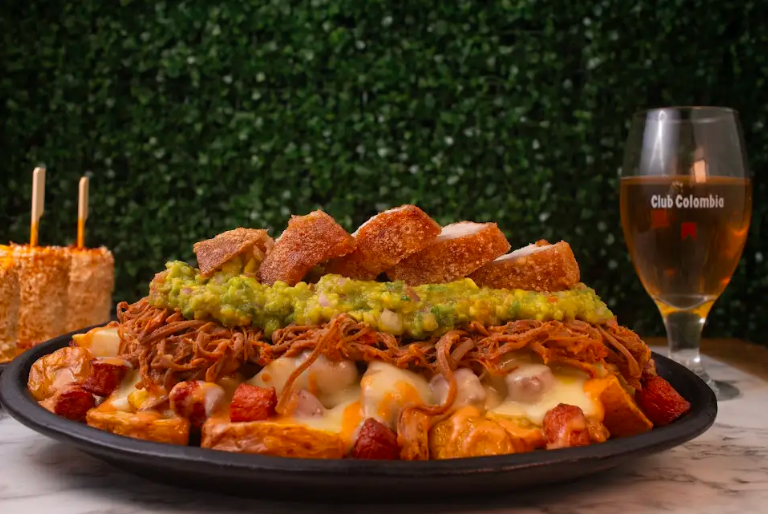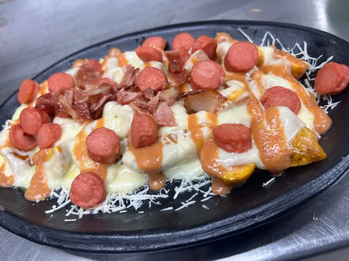 Papa criolla en cascos, mozzarella gratinado, salchicha ranchera, carne desmechada en reducción de vino tinto, guacamole, chicharrón crocante y salsa de tocineta.