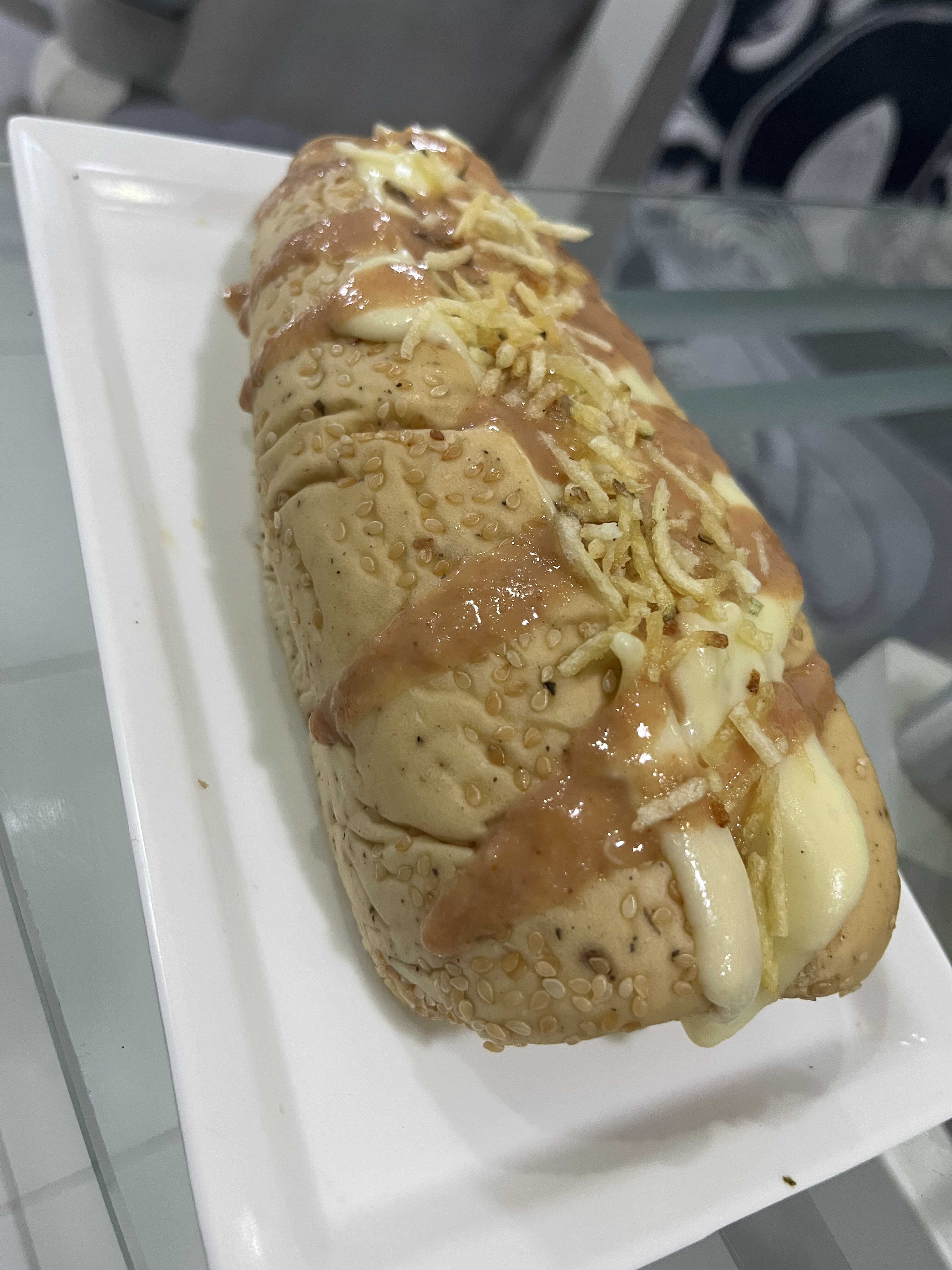 Papa criolla en cascos, salchicha cunit, mozzarella gratinado, tocineta picada y salsa de tocineta.