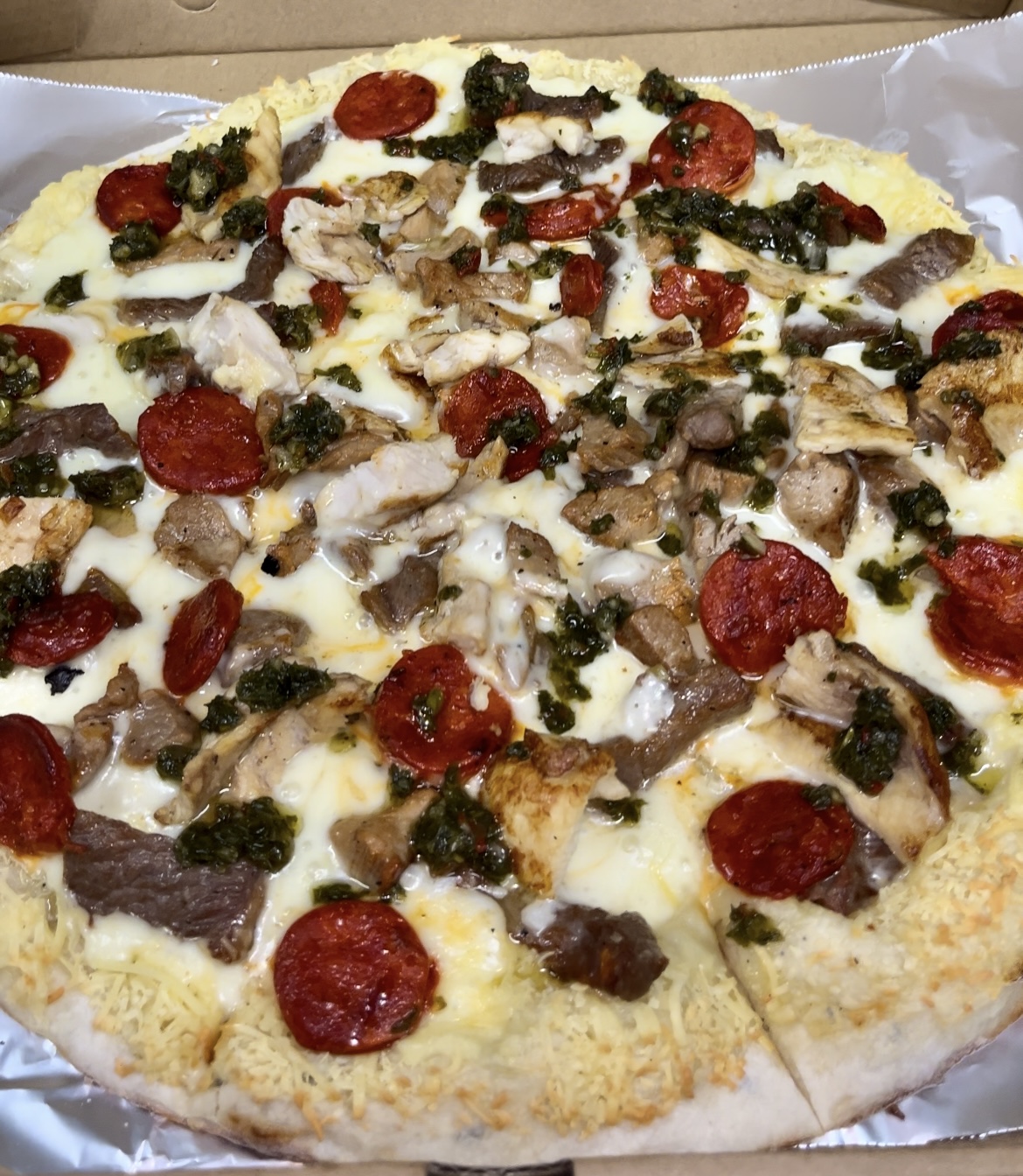 Salsa Alfredo, punta de anca, pechuga asada, lomo de cerdo, chorizo de res y chimichurri.