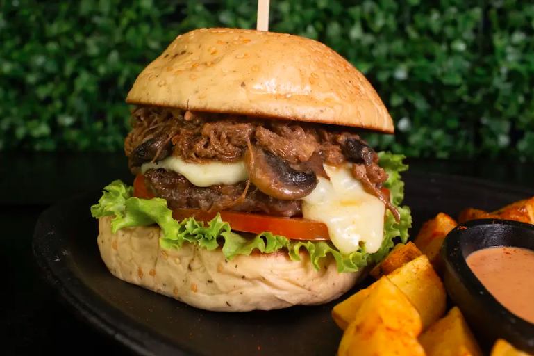 Pan finas hierbas, lechuga crespa, tomate, salsa de tocineta, carne de la casa 150 gr, carne desmechada en reducción de vino tinto, champiñones y queso mozzarella.