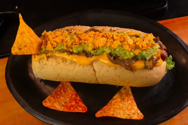 Pan finas hierbas, lechuga crespa salchicha Premium, carne desmechada en reducción de vino tinto, queso cheddar guacamole, doritos y salsa de tocinetas.