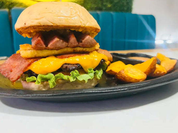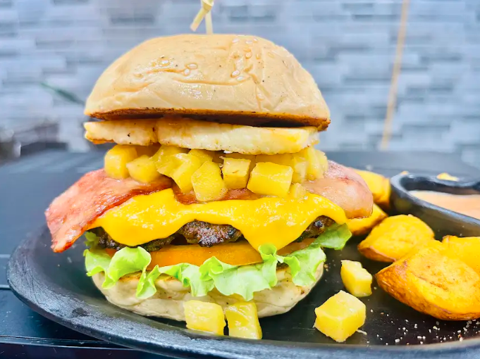 Pan finas hierbas, lechuga crespa, tomate, salsa de tocineta, carne de la casa 150 gr, media salchicha suiza, tocineta, queso costeño asado, piña en trozos y queso cheddar acompañada de papas criollas.