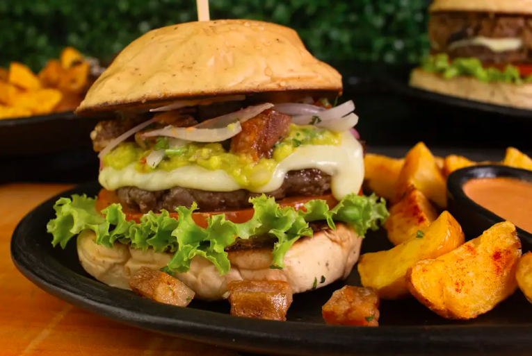 Pan finas hierbas, lechuga crespa, tomate, salsa de tocineta, carne de la casa 150 gr, guacamole, ceviche de chicharrón y queso mozzarella acompañada de papas criollas en casco.