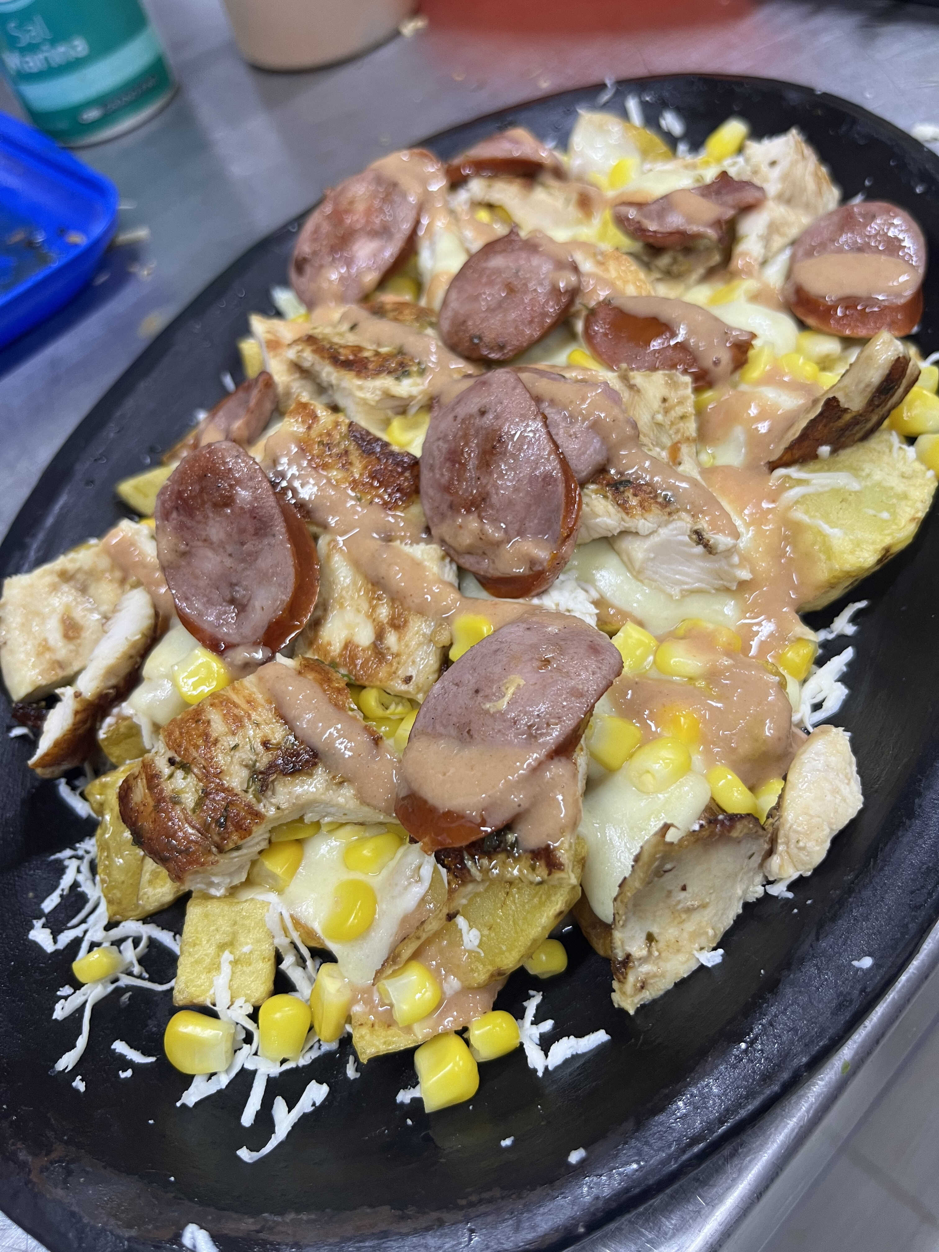 Papa criolla en cascos, salchicha suiza, pechuga de pollo, mozzarella gratinado, maíz y salsa de tocineta.