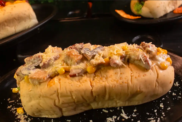 Pan finas hierbas, lechuga crespa, salchicha Premium, papita crencha, mix de pollo, champiñón, salchicha suiza en salsa Alfredo, queso, mozzarella, maíz, queso parmesano y salsa de tocineta.
