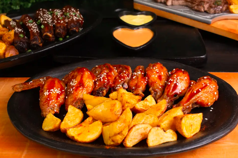 8 Piezas de alitas BBQ, acompañadas de papa criolla en cascos.