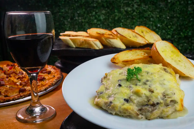 Pollo en salsa Alfredo, champiñones salteados en vino blanco con ajo y queso mozzarella.