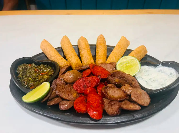 150 g punta de anca, 150 g pechuga, 250 g chicharrón, chorizo de cerdo, papa criolla en casco, papa francesa, chimichurri y salsa de ajo.
