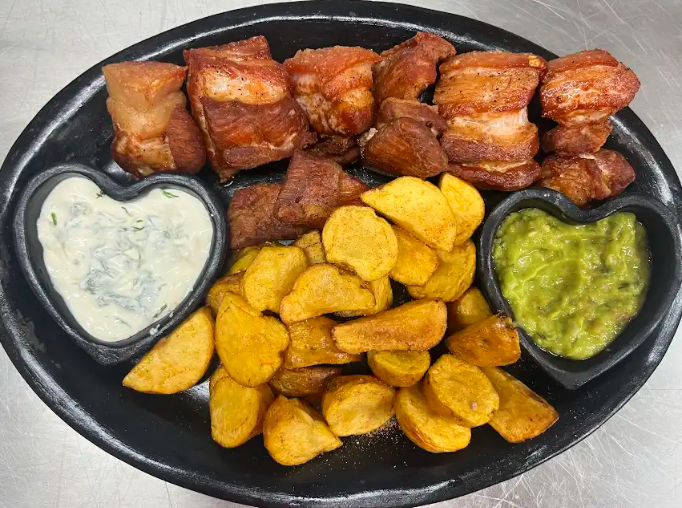 500gr de chicharron de cerdo crocante acompañado de papa criolla en casco, guacamole y suero de la casa.
