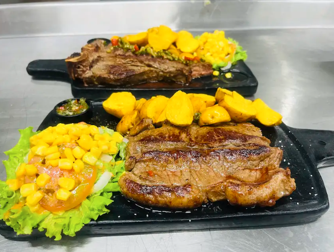 300 g de churrasco de res, acompañado de ensalada, papa criolla en cascos, chimichurri y salsa de ajo de la casa.