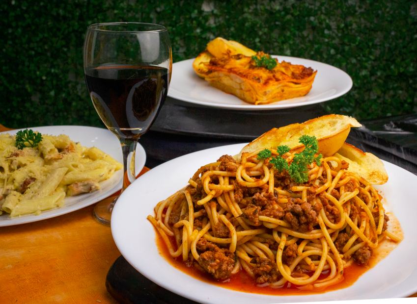 Pasta a elección, salsa napolitana, carne molida y queso parmesano.