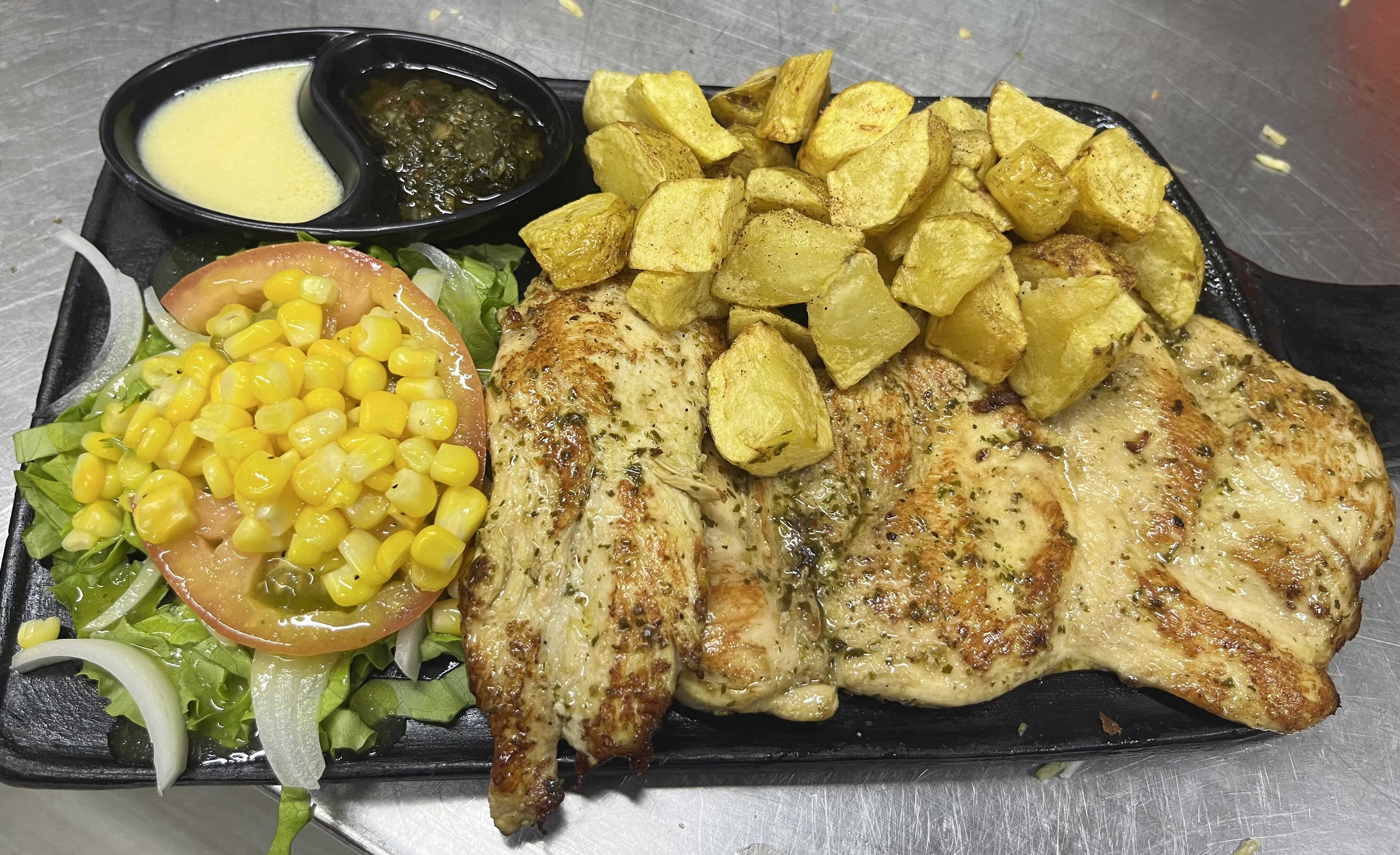 300 gr de pechuga de pollo asada, acompañada de ensalada, papa criolla en cascos, chimichurri y salsa de ajo de la casa