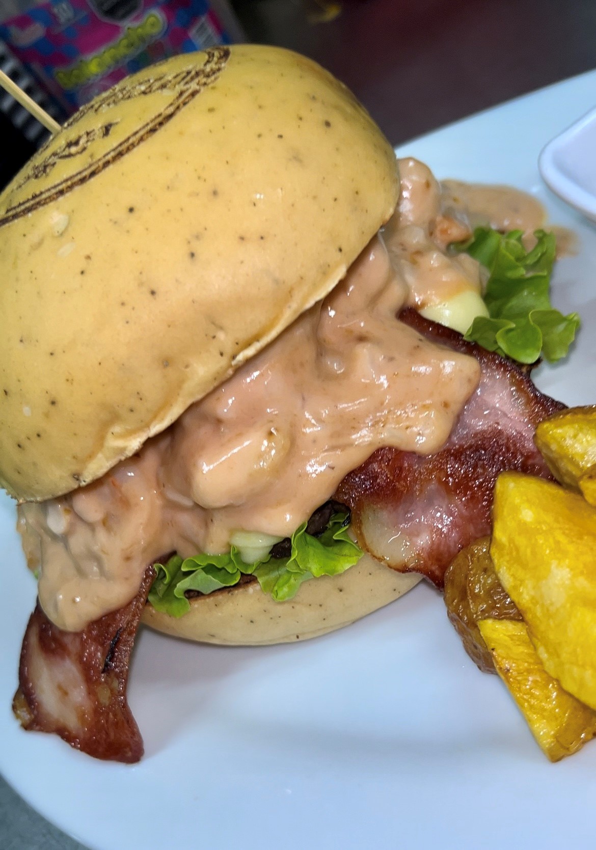 Pan finas hierbas, lechuga crespa, tomate, salsa de tocineta, cebolla caramelizada, doble carne de la casa 300gr, tocineta y queso cheddar acompañada de papas criollas en casco.