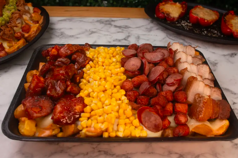 Papa criolla en cascos, salchicha cunit, mozzarella gratinado, costilla BBQ, maíz y salsa de tocineta.