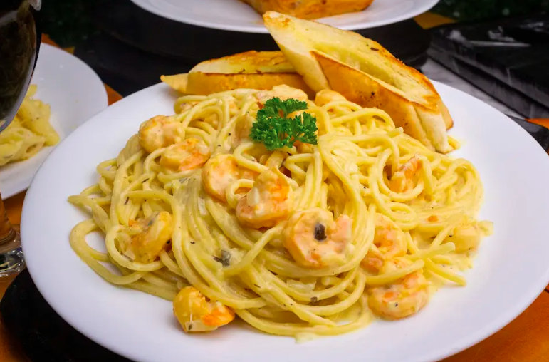 Pasta a elección (Fetuccini o Penne), salsa Alfredo, camarones salteados en vino blanco queso parmesano.